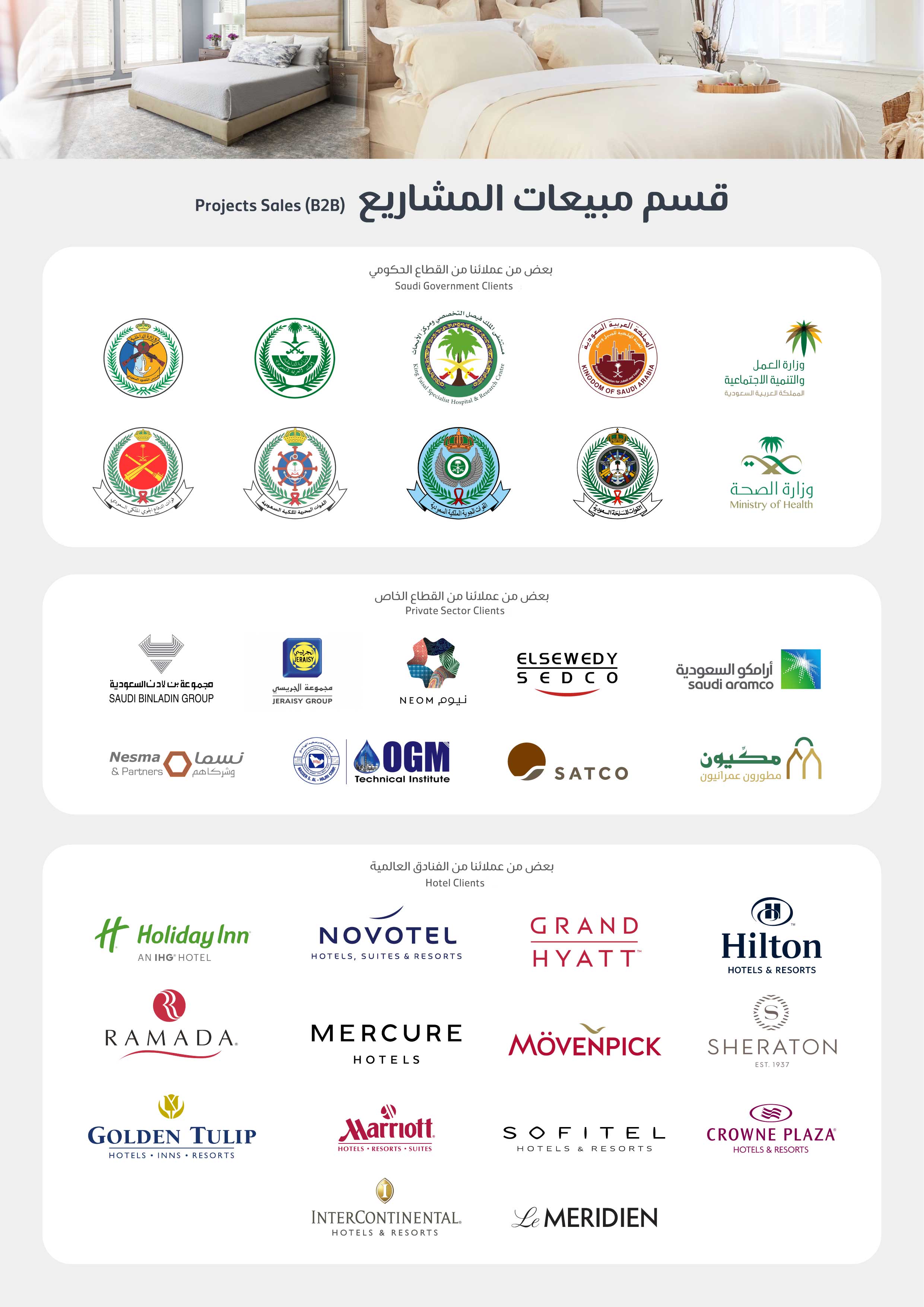 نتشرف بتوريد منتجاتنا (المراتب، الأسرة، المخدات، ومستلزمات النوم) لعدد كبيد من الشركات في القطاعين الحكومي والخاص، وإليكم بعض من عملاؤنا الذين يثقون في منتجات سليبي السعودية.